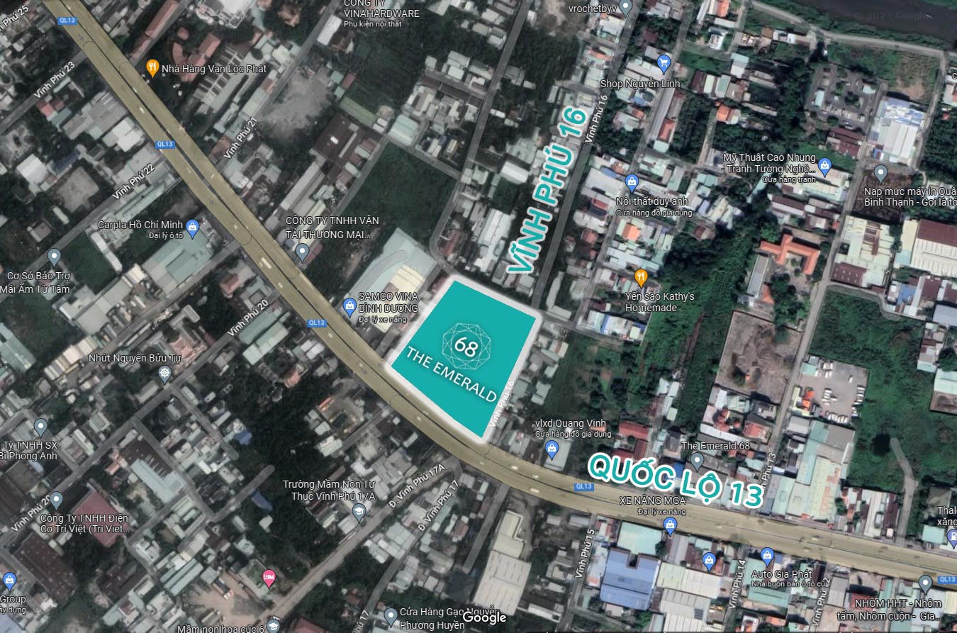 Dự án căn hộ The Emerald 68 sở hữu vị trí vàng nằm tại số 68 đường Vĩnh Phú 16 và Quốc lộ 13, thuộc phường Vĩnh Phú, TP. Thuận An, Tỉnh Bình Dương